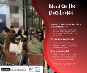 obraz promocyjny wydarzenia związanego z grą towarzyską Blood On The Clocktower. Po lewej stronie znajduje się rozmazane zdjęcie grupy osób siedzących w kręgu na krzesłach, prawdopodobnie podczas rozgrywki lub spotkania. Po prawej stronie, na czerwonym tle, umieszczony jest tekst informacyjny dotyczący wydarzenia