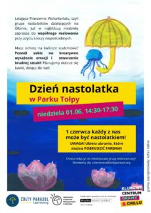 obraz informacyjny z kolorową, malowaną ilustracją meduzy i parasola na tle niebieskiej wody, z różowymi kwiatami lilii wodnych na dole.