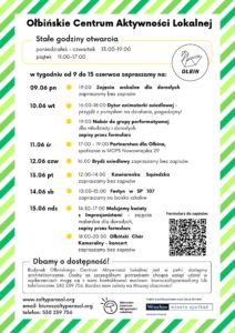 obraz tablica informacyjna białe tło na niej czarna czcionka ołbińskie centrum aktywności lokalnej wraz z opisem wydarzeń