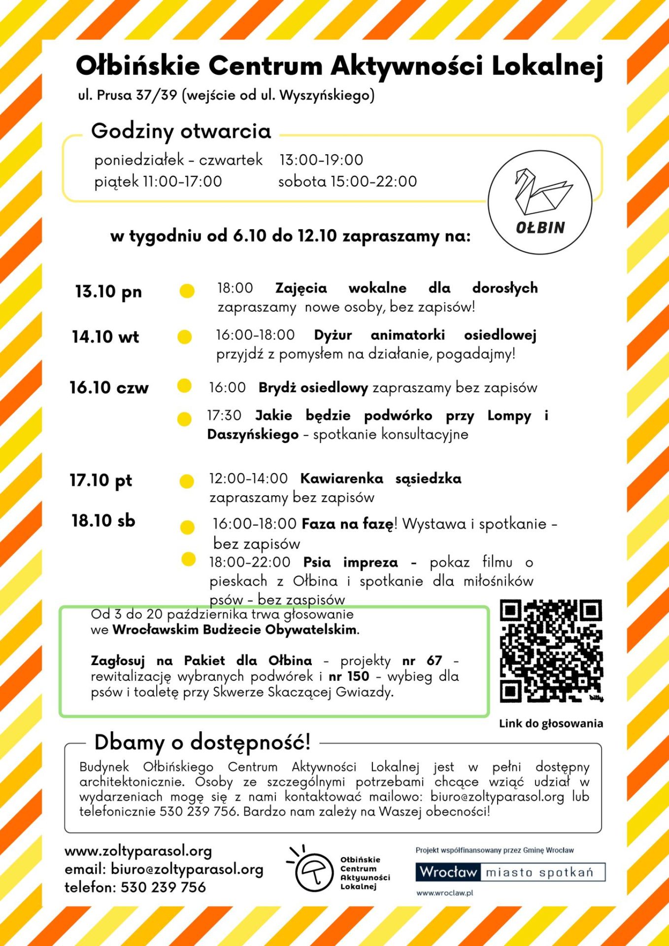 obraz tablica informacyjna białe tło na niej czarna czcionka ołbińskie centrum aktywności lokalnej wraz z opisem wydarzeń