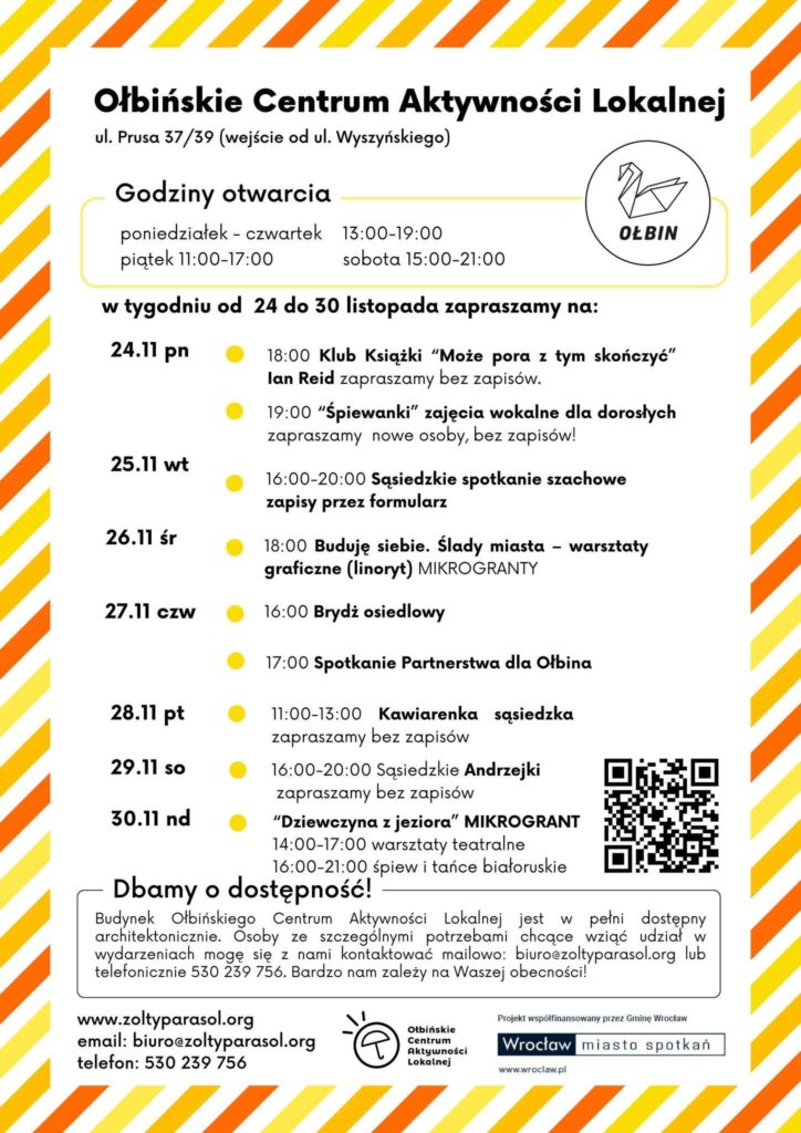 Mamy dla Was świeżutki harmonogram na nadchodzący tydzień – a w nim m.in pierwsze w Ołbińskim CAL spotkanie dla szachistów, ciekawe artystyczne Mikrogranty i Andrzejkowa potańcówka. Przyjdźcie sami lub w towarzystwie – każdy jest mile widziany!