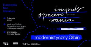 obraz promujący wydarzenie literackie. Na czarnym tle widnieją niebieskie i białe napisy oraz grafiki. Po lewej stronie znajduje się tekst: Europejska Noc Literatury po prawej stronie, większymi, odręcznymi literami napisano: impuls spacerowania. Pod spodem znajduje się niebieski prostokąt z białym napisem: modernistyczny Ołbin. Obok widoczny jest rysunek długopisu. W tle biegną przerywane, niebieskie linie przypominające trasę spaceru.