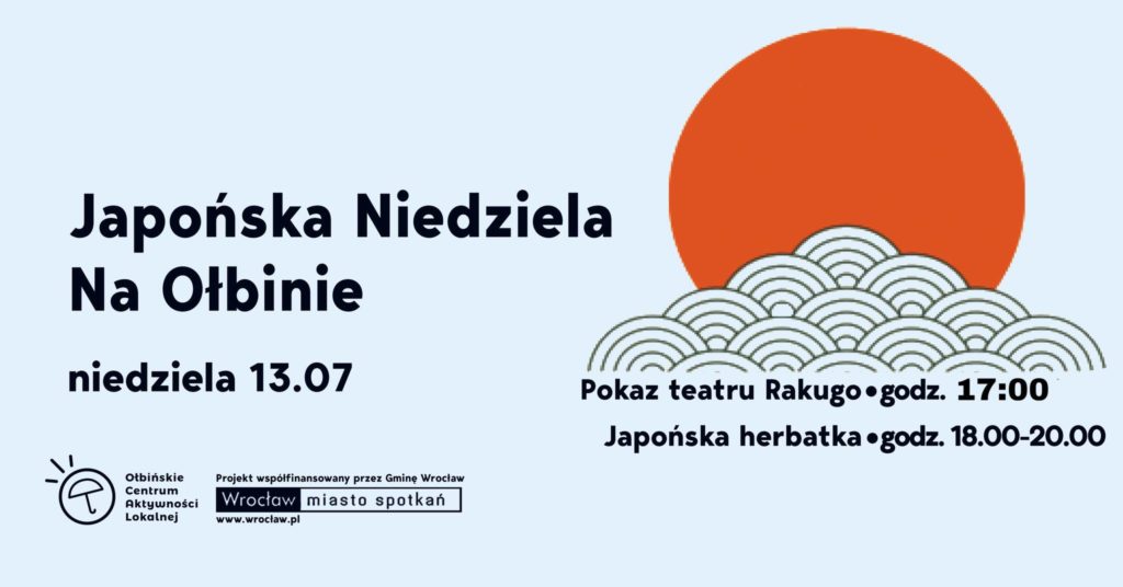 obraz Po lewej stronie na jasnoniebieskim tle znajduje się duży, czarny napis: "Japońska Niedziela Na Ołbinie" Po prawej stronie plakatu znajduje się graficzne przedstawienie pomarańczowego koła (symbolizującego słońce) oraz stylizowanych fal. Obok nich napis: "Pokaz teatru Rakugo • godz. 17:00" oraz "Japońska herbatka • godz. 18.00-20.00". Całość utrzymana jest w minimalistycznym stylu, z dominującymi kolorami: jasnoniebieskim, czarnym i pomarańczowym