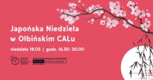 obraz na czerwonym tle znajduje się gałąź kwitnącej wiśni z różowymi kwiatami. Tekst na plakacie informuje, że wydarzenie odbędzie się w niedzielę 18.05 w godzinach 16:30-20:00. Na dole plakatu znajdują się logotypy Ołbińskiego Centrum Aktywności Lokalnej oraz informacja, że projekt jest współfinansowany przez Gminę Wrocław z adresem strony internetowej www.wroclaw.pl.