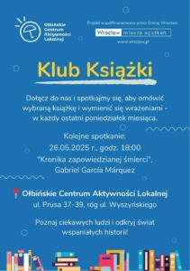 obraz plakat promujący Klub Książki organizowany przez Ołbińskie Centrum Aktywności Lokalnej. Na niebieskim tle znajduje się tekst zachęcający do dołączenia do klubu, aby omówić wybraną książkę i wymienić się wrażeniami. Kolejne spotkanie odbędzie się 31.03.2025 o godzinie 18:00, a omawiana będzie książka "Mur duchów" autorstwa Sarah Moss. Na dole plakatu znajduje się informacja o Ołbińskim Centrum Aktywności Lokalnej oraz zachęta do poznania ciekawych ludzi i odkrycia świata wspaniałych historii. W tle widoczne są ikony książek i symboliczne grafiki