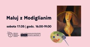 obraz na różowym tle znajduje się tekst informujący o terminie wydarzenia: "sobota 17.05 | godz. 16.00-19.00". Po lewej stronie widnieje logo Ołbińskiego Centrum Aktywności Lokalnej, a poniżej informacja, że projekt jest współfinansowany przez Gminę Wrocław z adresem strony www.wroclaw.pl. Po prawej stronie plakatu znajduje się reprodukcja obrazu w stylu Modiglianiego, przedstawiająca kobietę w kapeluszu. Na dole po prawej stronie widoczna jest paleta malarska z kilkoma kolorami farb i pędzlem