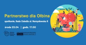 obraz po lewej stronie na niebieskim tle żółty napis partnerstwo dla ołbina po prawej plac budowy