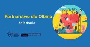 obraz po lewej stronie na niebieskim tle żółty napis partnerstwo dla ołbina po prawej plac budowy