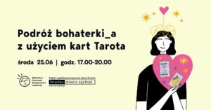 obraz po lewej stronie na jasnym tle znajduje się czarny, pogrubiony napis: "Podróż bohaterki_a z użyciem kart Tarota". Po prawej stronie ilustracja uśmiechniętej osoby z ciemnymi włosami, trzymającej przed sobą różowe serce z dwoma kartami tarota. Nad głową osoby żółte gwiazdki i różowe serce połączone linią, sugerujące pozytywne myśli lub inspirację. Całość utrzymana w jasnych, pastelowych kolorach